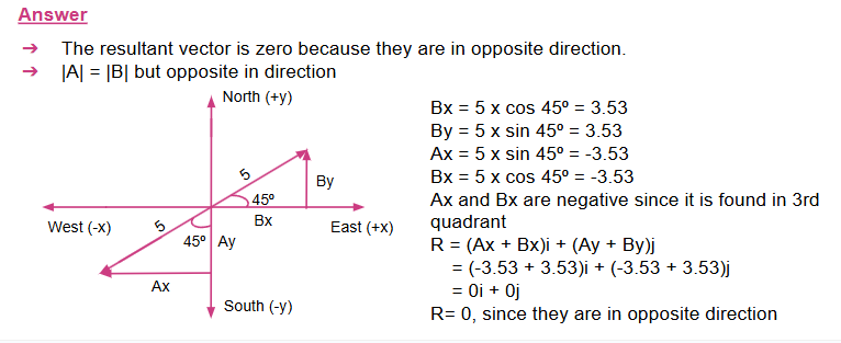 1. Two vectors A and B have the same magnitude of 5 units and they start from the origin: B points to the North East and A points to the South West exactly opposite to vector B. What would be the magnitude of the resultant vector? Why?