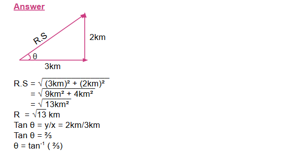 A boy walks 3 km due East and then 2 km due North. What is the magnitude and direction of his displacement vector?