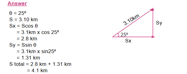 4. A girl walks 25.0o North of East for 3.10 km. How far would she have to walk due North and due East to arrive at the same location?