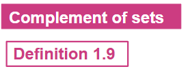 Let 𝐴 be a subset of a universal set 𝑈. The absolute complement (or simply complement) of 𝐴, which is denoted by 𝑨′ , is defined as the set of all elements of 𝑈 that are not in 𝐴. We write this mathematically as 𝐴′ = {𝑥: 𝑥 ∈ 𝑈 and 𝑥 ∉ 𝐴}.