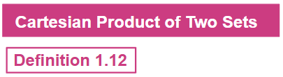 Cartesian Product of Two Sets The Cartesian product of two sets 𝐴 and 𝐵, denoted by 𝐴 × 𝐵, is the set of all ordered pairs (𝑎, 𝑏) where 𝑎 ∈ 𝐴 and 𝑏 ∈ 𝐵. This also can be expressed as 𝐴 × 𝐵 = {(𝑎, 𝑏): 𝑎 ∈ 𝐴 and 𝑏 ∈ 𝐵}.