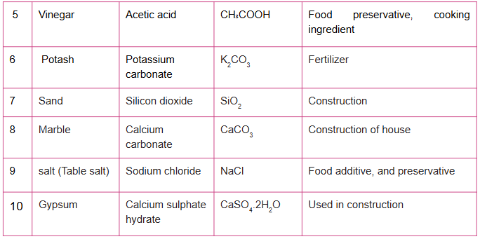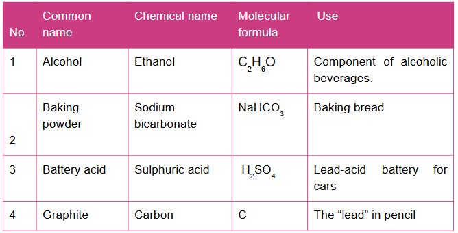 1. List the common names together with the chemical names, formula, and use of 10 household chemicals.