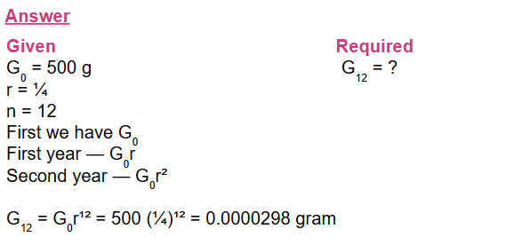A 500 g radioactive element decays to ¼  of its mass in per years. How much will remain after 12 years