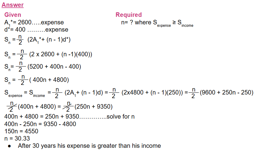 b. His initial annual expenses are 2600 ETB, which increases at a rate of 400 ETB per year. After how many years will his expense exceed his income?