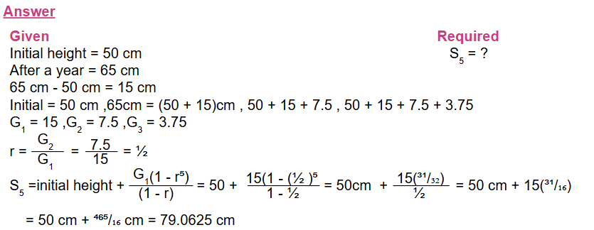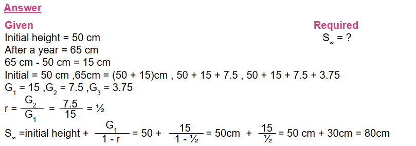 A bamboo plant is initially 50 cm tall. After one year, it grows to 65 cm. Each year, the growth is half the growth of the previous year.