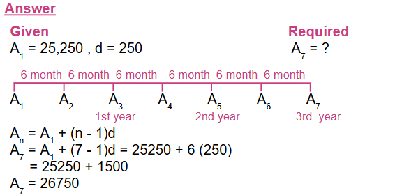 1. A person is scheduled to get a raise of Birr 250 every 6 months during his/her first 5 years on the job. If his/her starting salary is Birr 25,250 per year, what will his/her annual salary be at the end of the 3rd year?