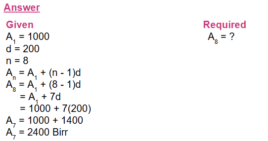 2. Bontu begins a saving program in which she will save Birr 1,000 the first year,   and each subsequent year she will save 200 more than she did the previous year. How much will she save during the eighth year ?