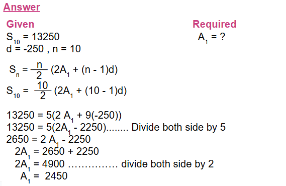 3. A contest offers 10 prizes with a total value of Birr 13,250. If the difference in value   between consecutive prizes is Birr 250, what is the value of the first prize?